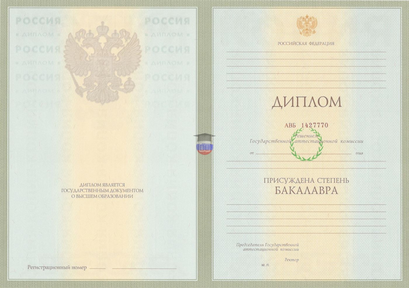 Диплом бакалавра — базовый документ о высшем образовании. Именно он подтверждает успешное прохождение четырехлетнего курса обучения с присвоением академической степени. Бланк заполняется по стандартам образования и науки России. Степени защиты — герб России, сетка из непрерывных линий, офсетная печать, водяные знаки, уникальный регистрационный номер, возможность копирования на принтере. Оценочный лист и синяя корочка в комплекте.