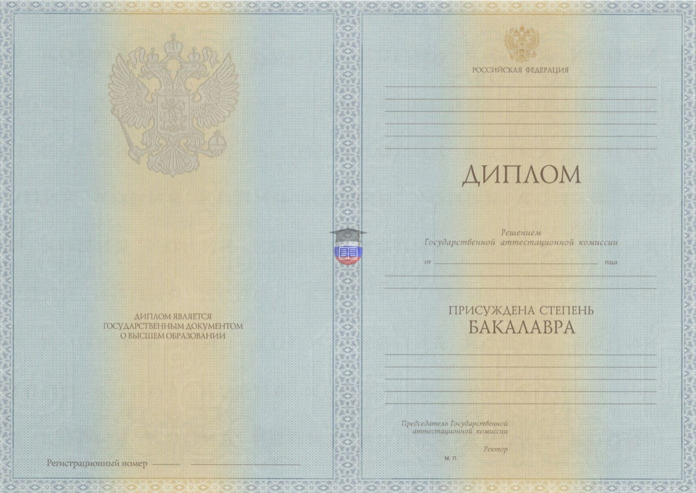 Диплом бакалавра — базовый документ о высшем образовании. Именно он подтверждает успешное прохождение четырехлетнего курса обучения с присвоением академической степени. Бланк заполняется по стандартам образования и науки России. Степени защиты — герб России, сетка из непрерывных линий, офсетная печать, водяные знаки, уникальный регистрационный номер, возможность копирования на принтере. Оценочный лист и синяя корочка в комплекте.