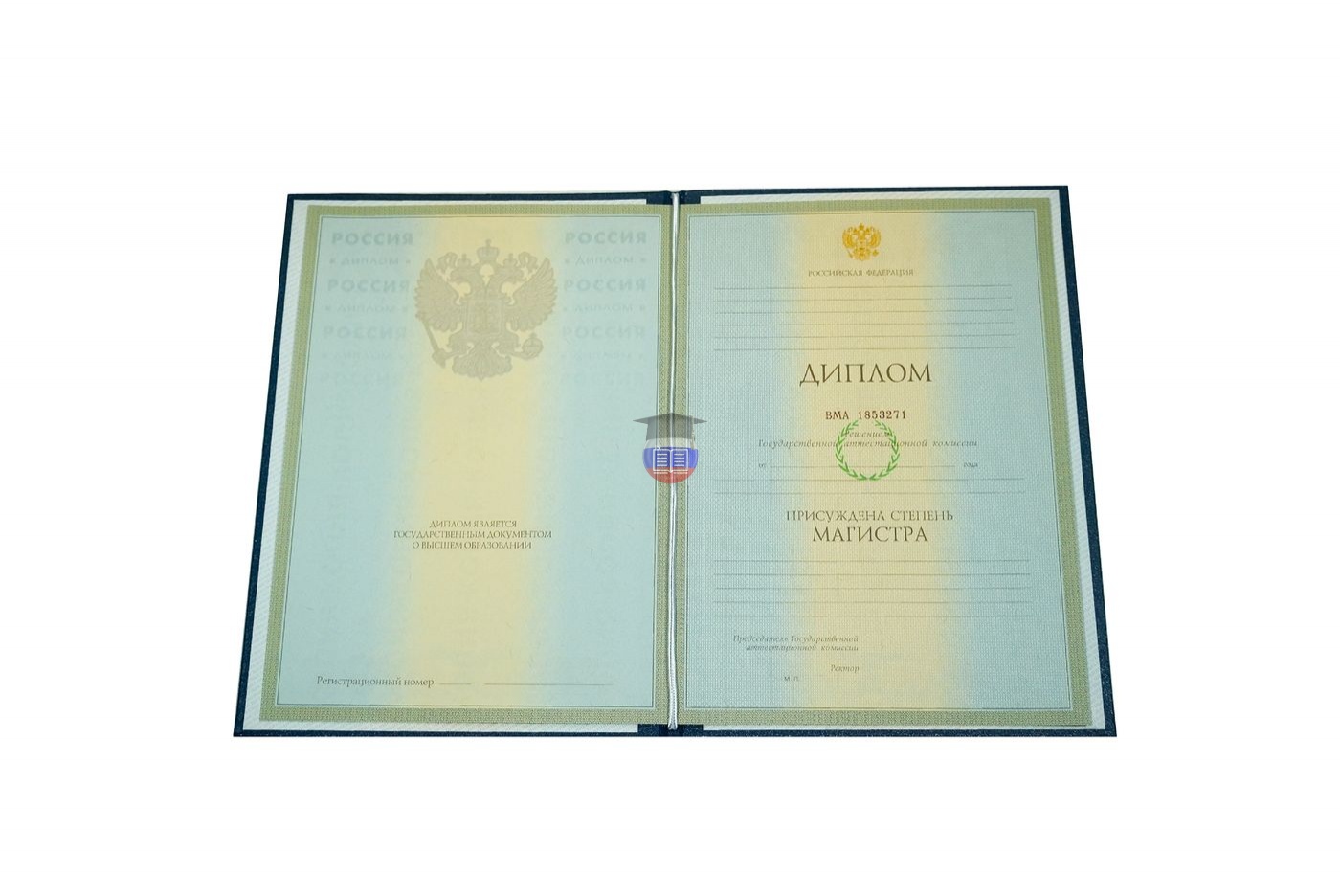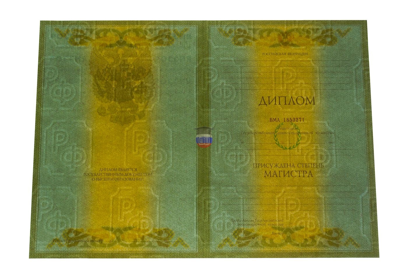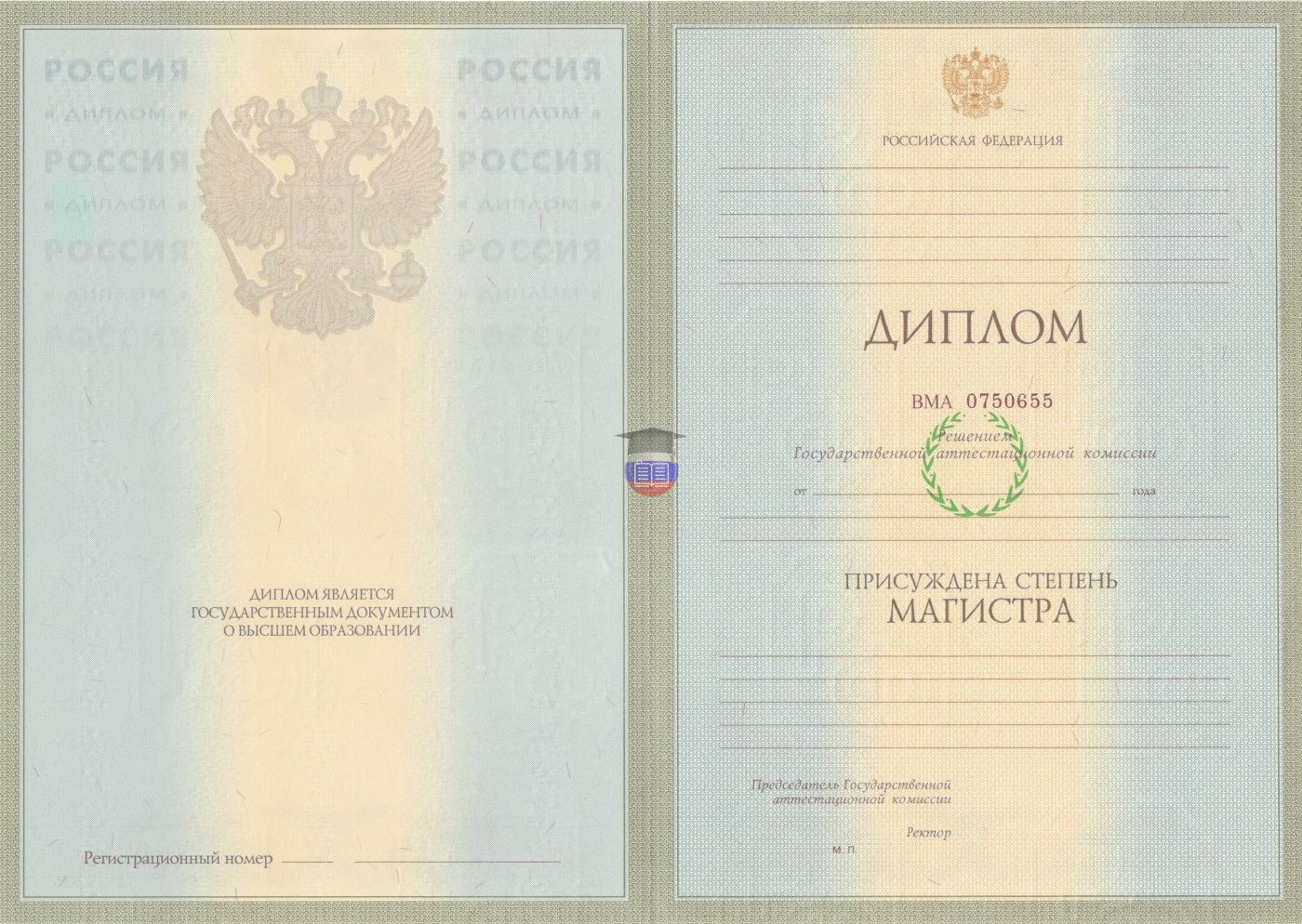 Диплом магистра печатается на бланке государственного образца «ГОЗНАК». Документ включает приложение и синюю корочку. Защитные элементы бланка — специальные водяные знаки, микротекст, узор из непрерывных линий, герб России, цветовой переход. Бумага с подлинной печатью учебного учреждения заполняется согласно его уставу.