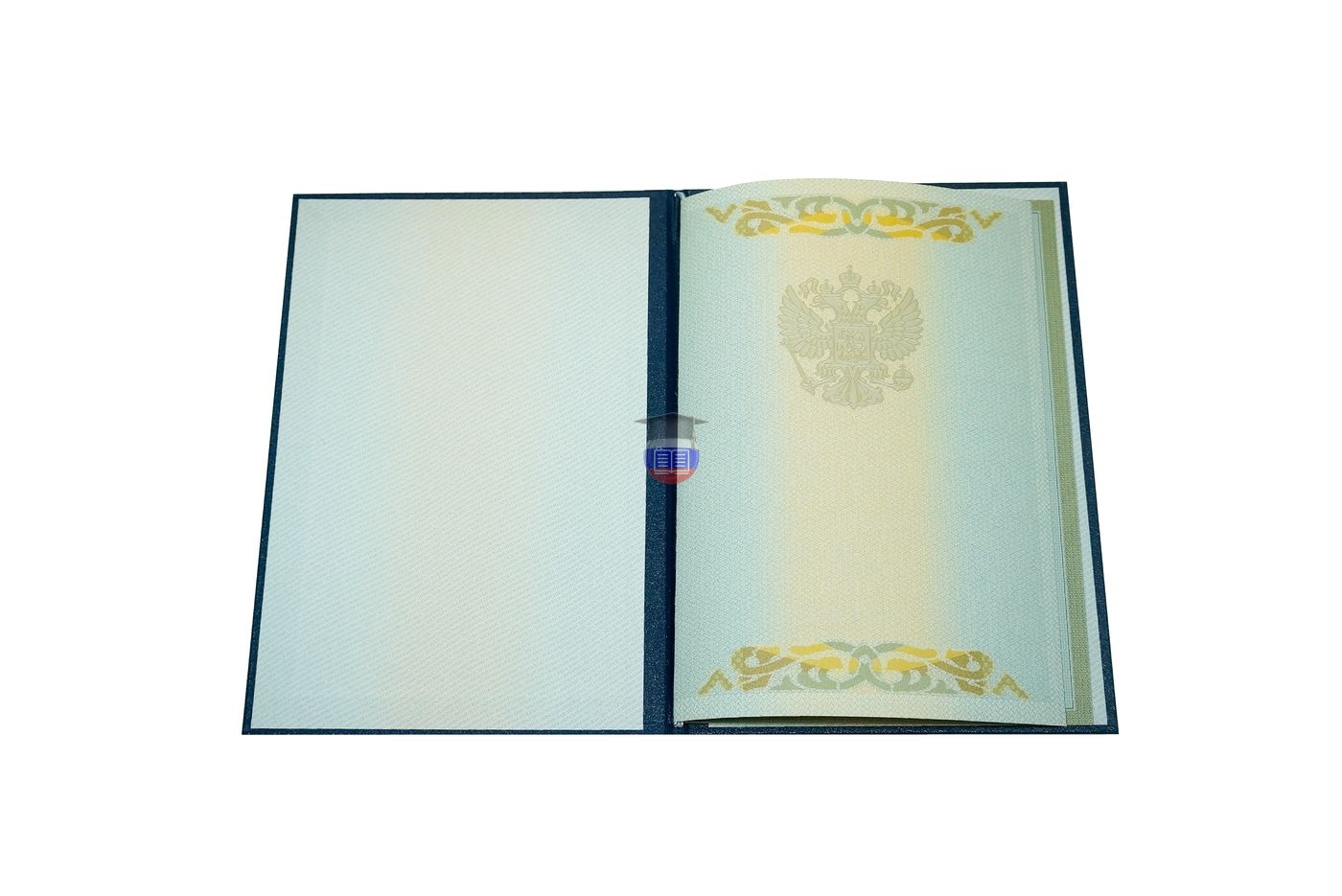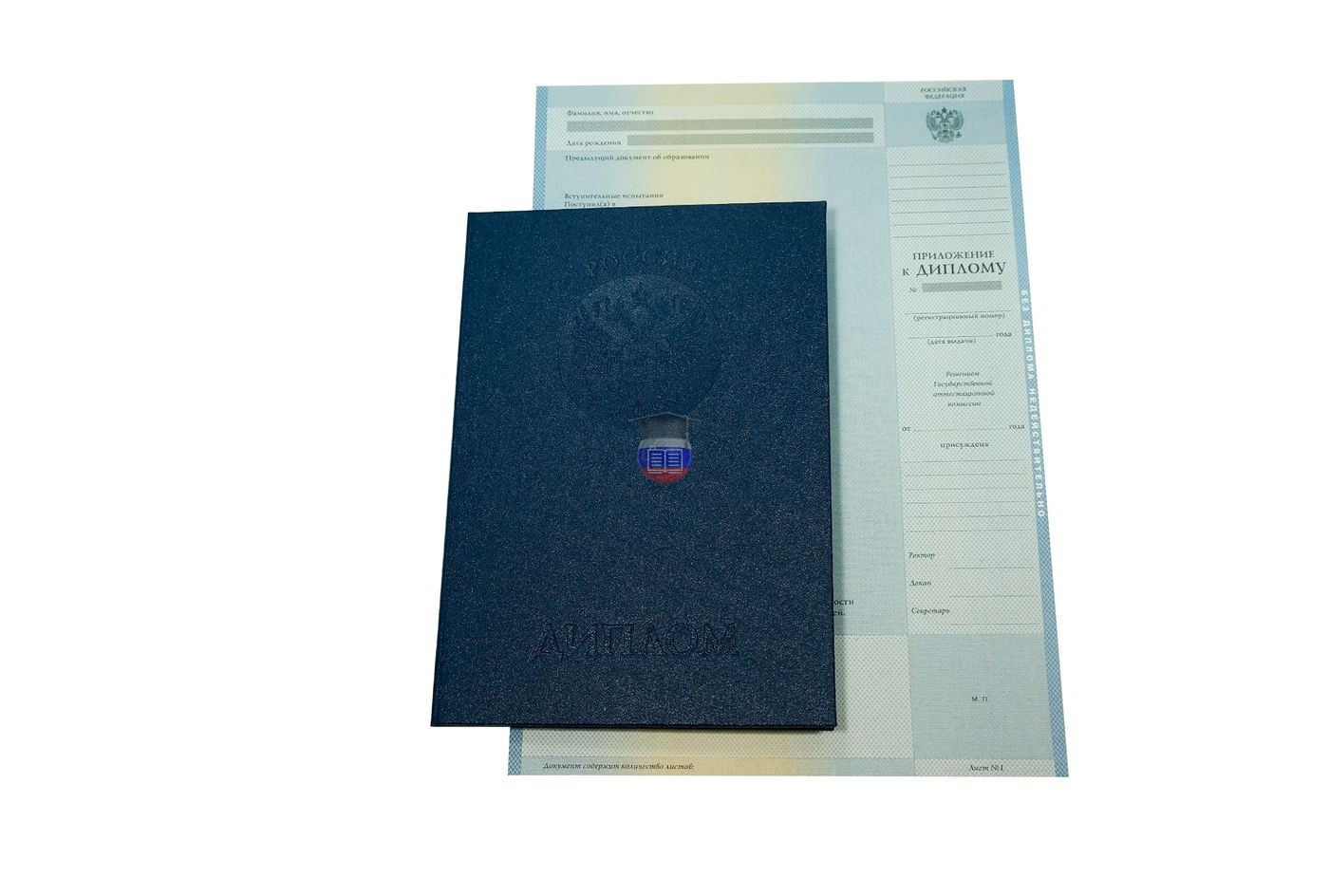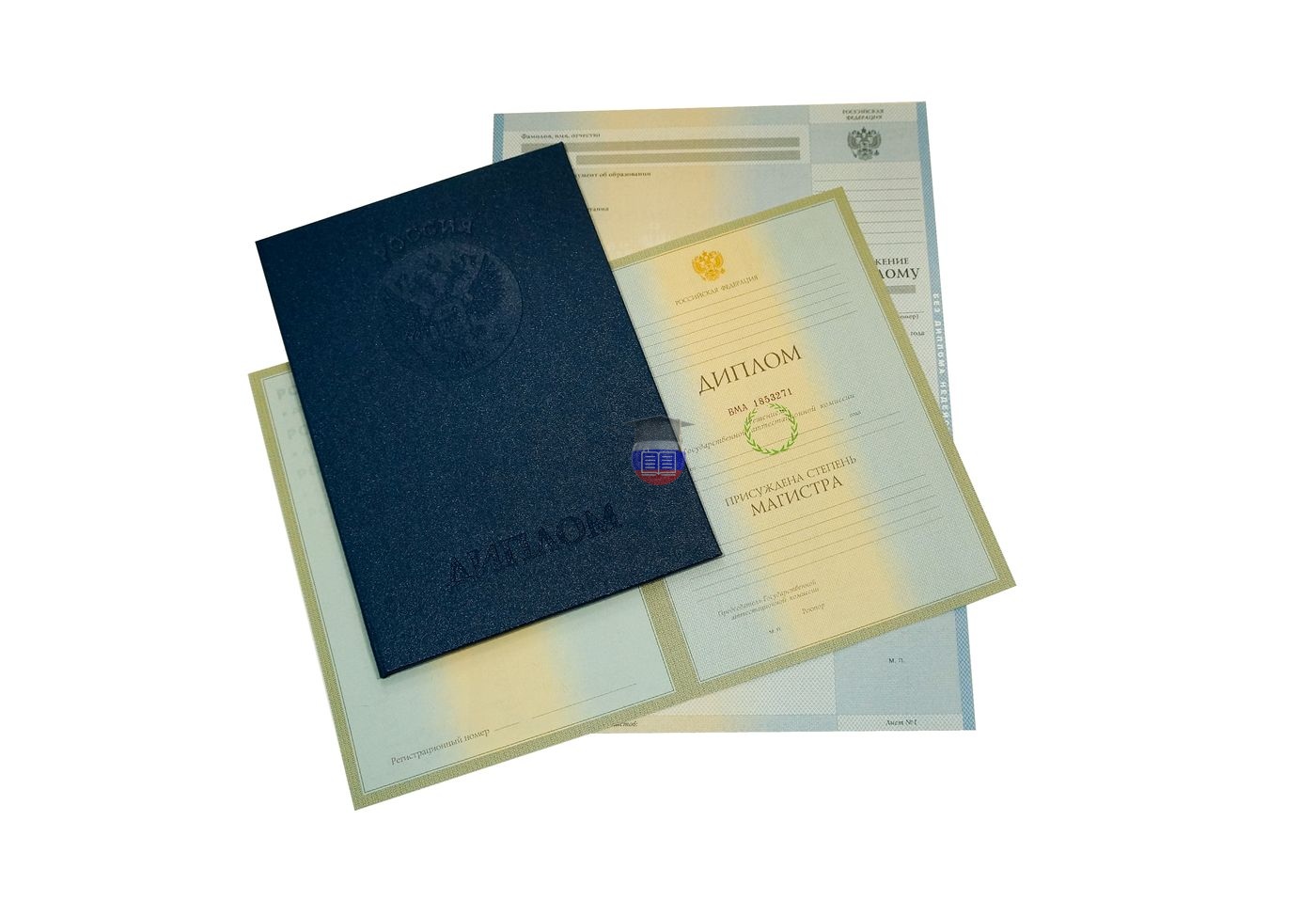 Диплом магистра печатается на бланке государственного образца «ГОЗНАК». Документ включает приложение и синюю корочку. Защитные элементы бланка — специальные водяные знаки, микротекст, узор из непрерывных линий, герб России, цветовой переход. Бумага с подлинной печатью учебного учреждения заполняется согласно его уставу.
