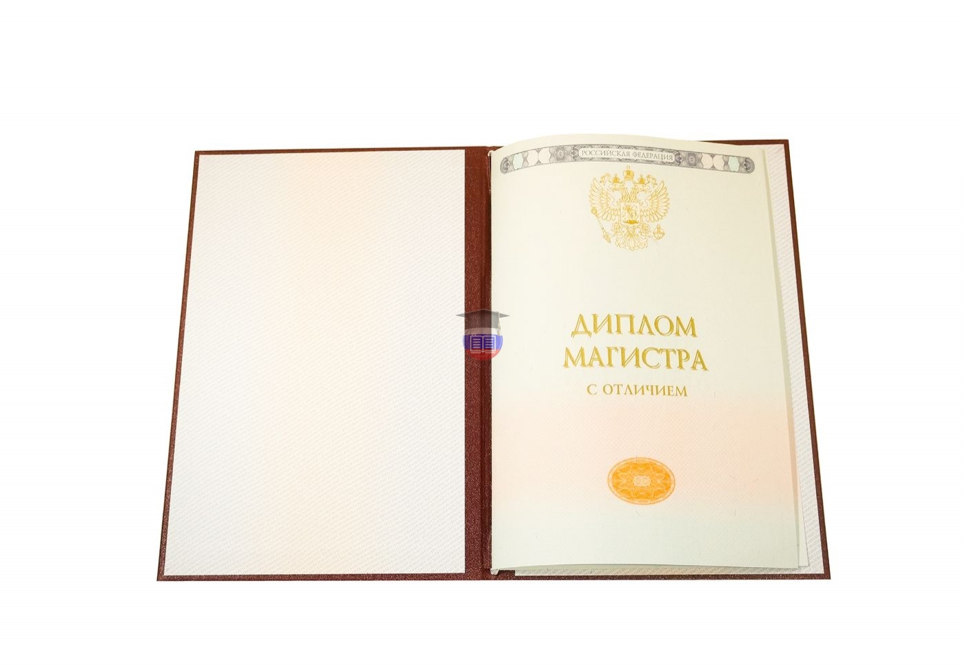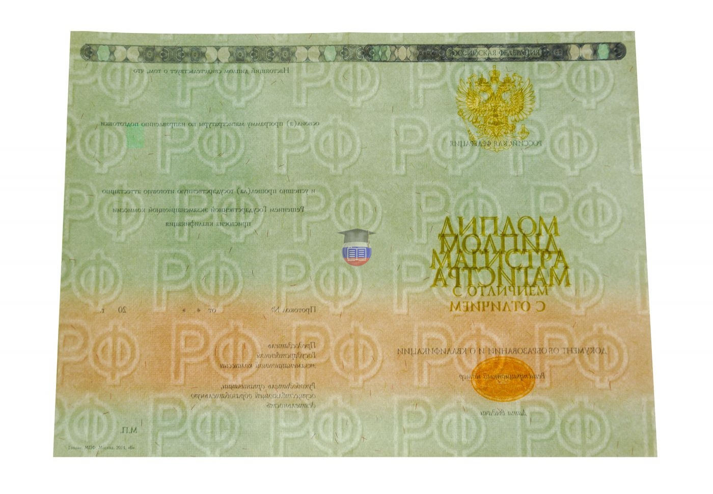 Диплом магистра напечатан на бланке государственного образца «ГОЗНАК». Документ включает приложение и красную корочку. Защита бланка — специальные водяные знаки, микротекст, светоотражающие элементы, герб России, плавный цветовой переход. Бумага с подлинной печатью учебного учреждения заполняется согласно его уставу.